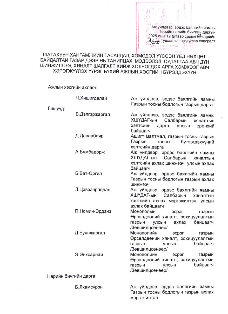 Дээрх арга хэмжээний хүрээнд Аж үйлдвэр эрдэс баялгийн яамнаас дараах ажлын хэсгийн бүрэлдэхүүн гарч ажиллаж байна. Үүнд,