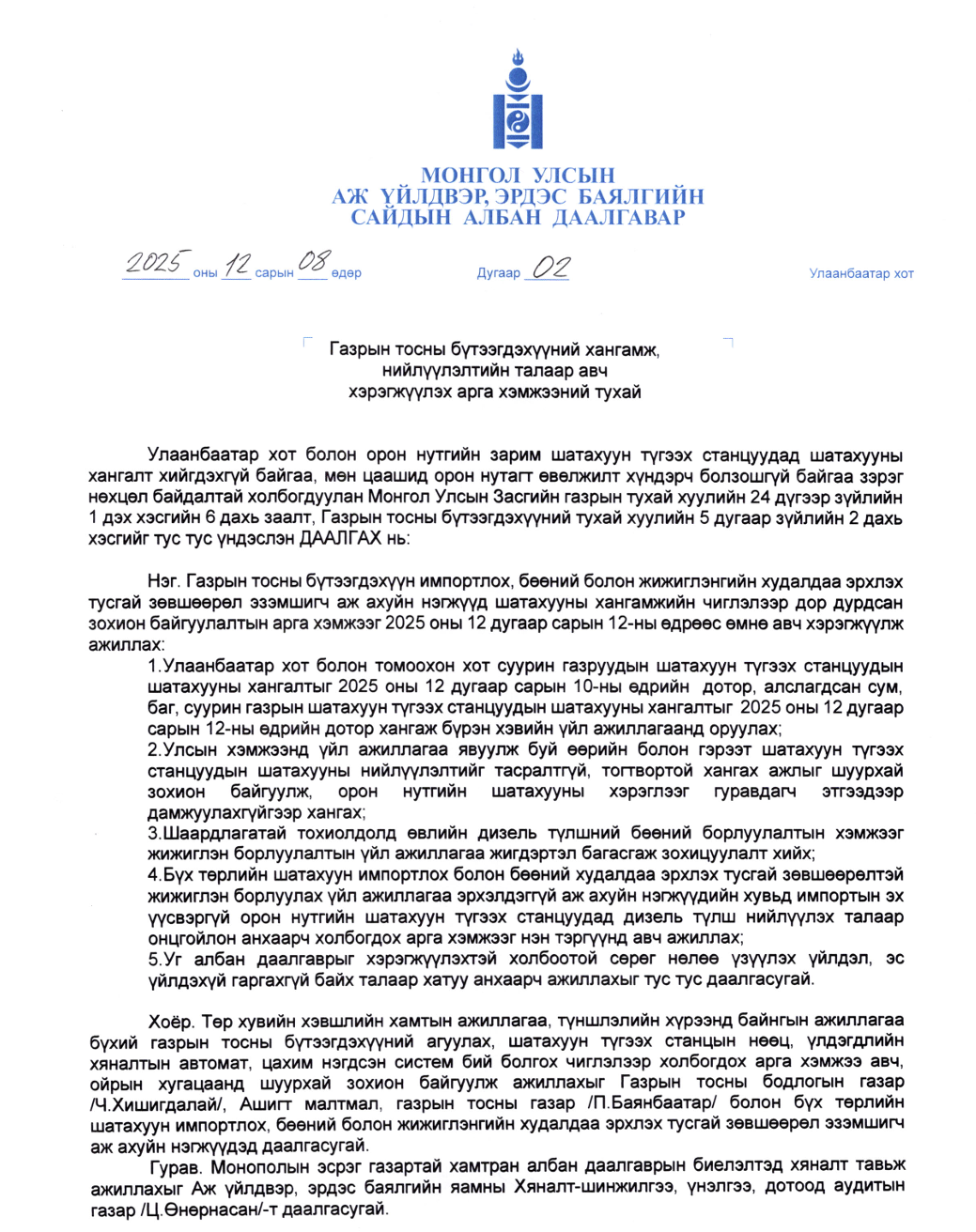 Аж үйлдвэр, эрдэс баялгийн сайд Г.Дамдинням өчигдөр шатахуун импортлогчидтой уулзаж дөрөв хоногийн дотор түгээлтийг тогтвортой болгож, орон нутгийн шатахууны хэрэглээг гуравдагч этгээдээр дамжуулахгүйгээр хангах албан даалгавар гаргасан. Энэ хүрээнд Газрын тосны бүтээгдэхүүний хангамж, нийлүүлэлтийн талаар  дараах арга хэмжээг 2025 оны 12 дугаар сарын 12-ны өдрөөс өмнө авч хэрэгжүүлэхээр болов.